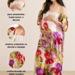 Vestido gestante de comprimento médio ou longo: resolve o look em peça única, dribla variações de temperatura (basta adicionar um casaco) e elimina qualquer pressão abdominal. Tecidos fluidos evitam que a roupa cole na pele, garantindo ventilação.