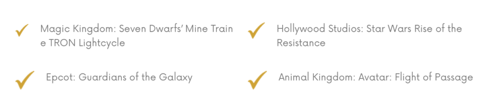 • Visitas ao Magic Kingdom e ao Disney’s Hollywood Studios, parques com grande concentração de atrações populares.