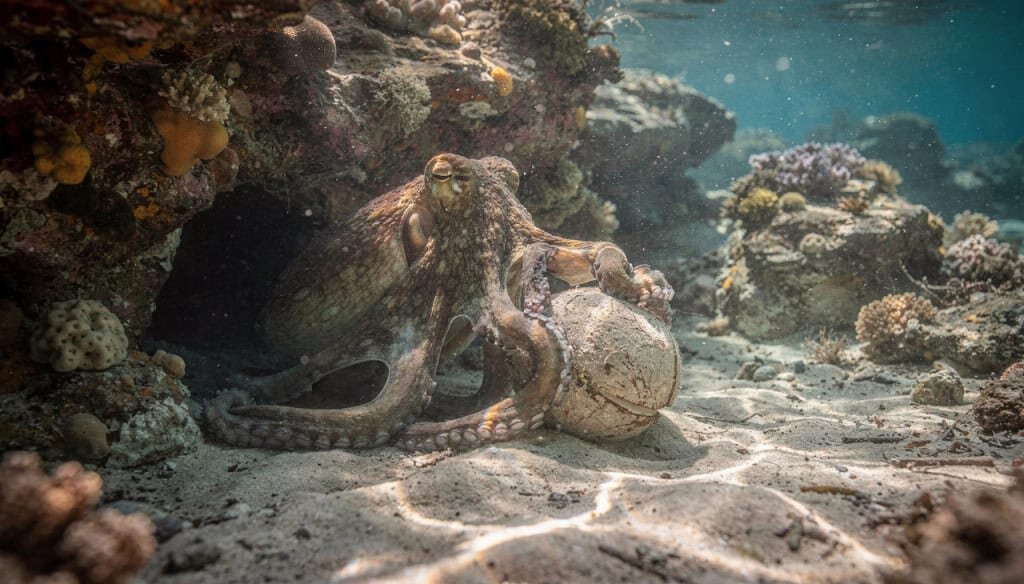 No habitat marinho, os polvos foram vistos transportando e empilhando cascas de coco, pedras e conchas. As cascas podem funcionar como abrigo móvel ou, quando acopladas, como uma espécie de armadura improvisada. Essa coleta estratégica exige identificar, selecionar e deslocar materiais apropriados, habilidades que combinam percepção, força e planejamento.